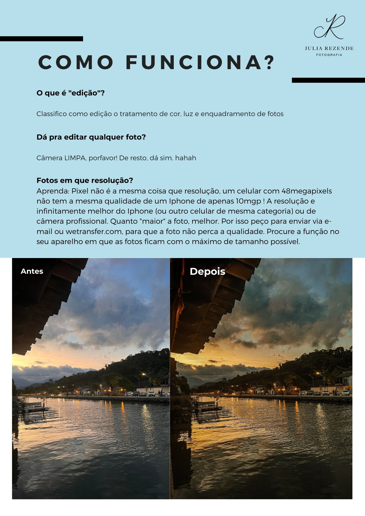 - Edição Fotográfica Excepcional: Suas fotos merecem brilhar, e é por isso que oferecemos serviços de edição profissional. Ajustamos cores, contraste e iluminação para realçar a beleza de cada imagem, garantindo que seus momentos sejam retratados da maneira mais deslumbrante possível.