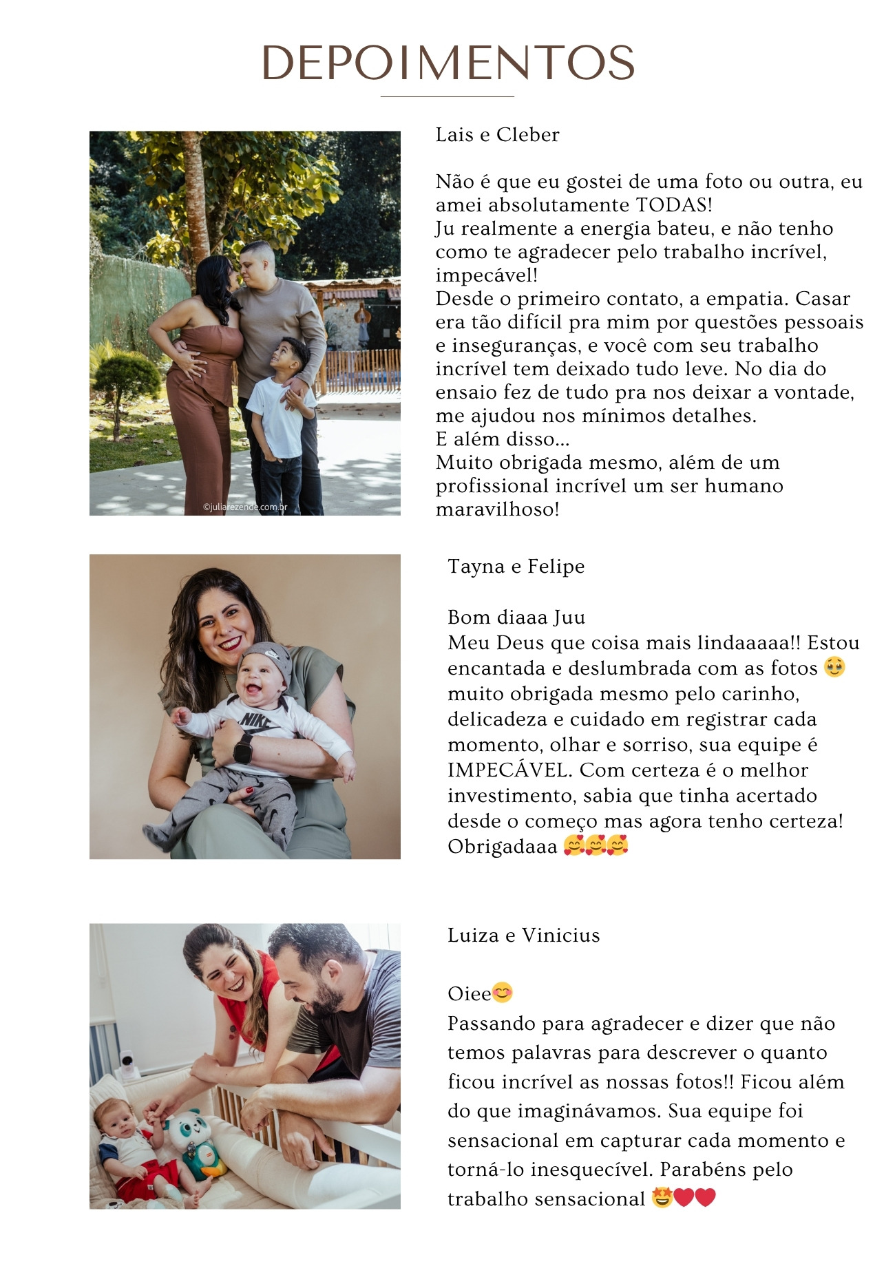 "Não tenho palavras para elogiar o seu trabalho, estou mais do que satisfeita, hoje revivi o meu dia, vendo as fotos me emocionei, não consigo saber qual amo mais. Você e sua equipe estão de parabéns. Se eu pudesse escolher mais 100 profissionais, escolheria as 100 vezes você"