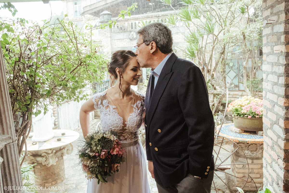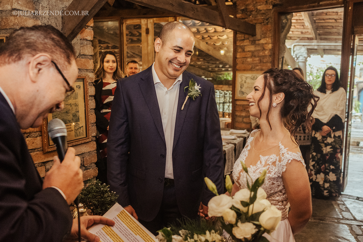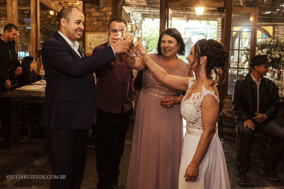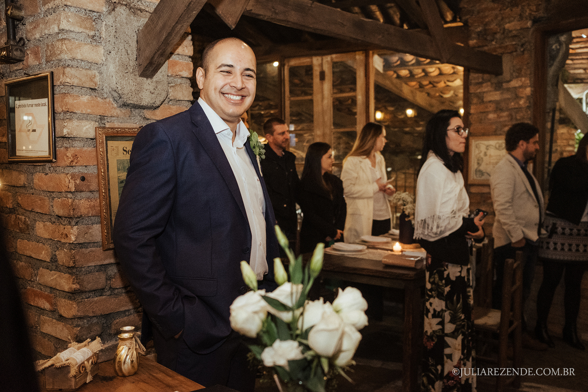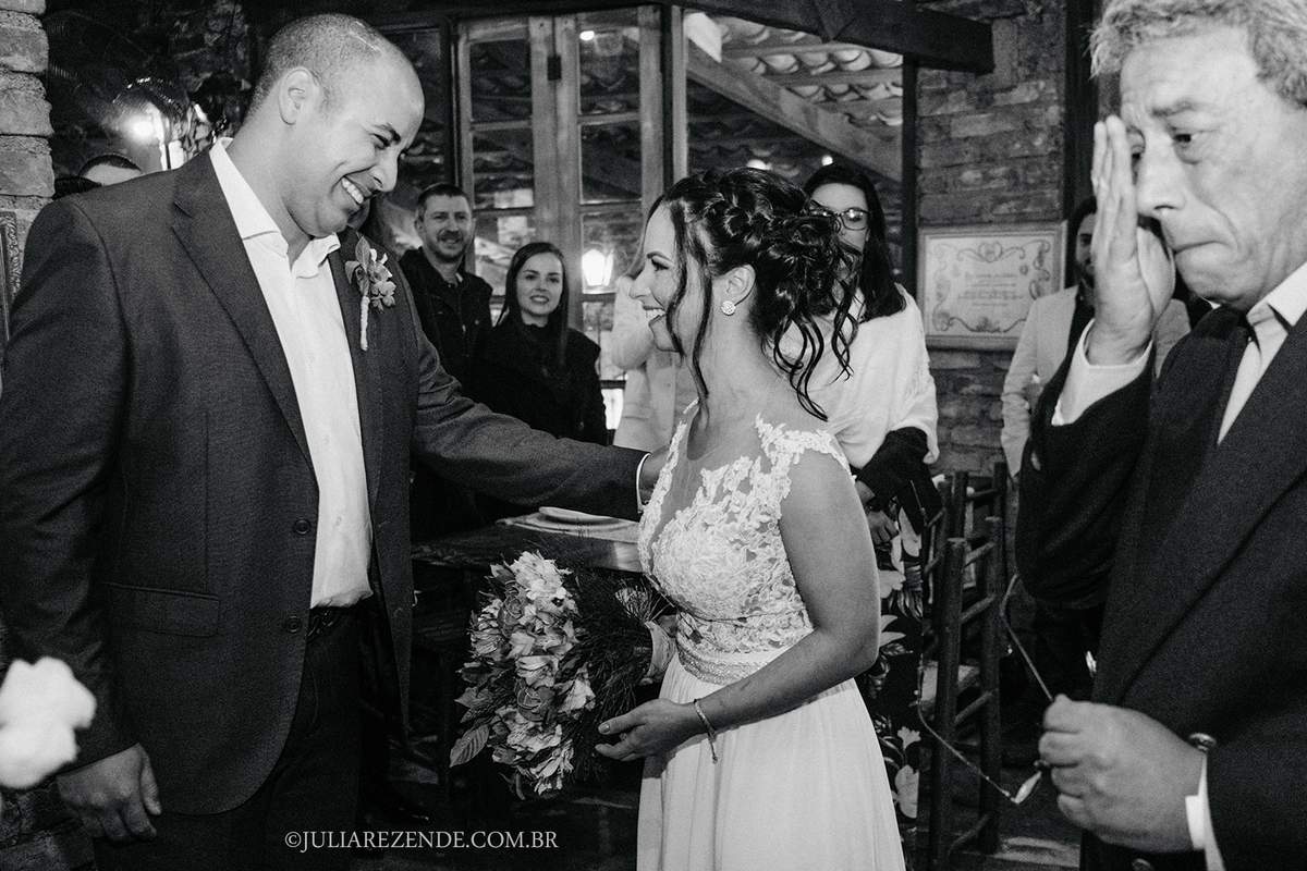O casamento foi para 30 pessoas, em um almoço durante uma tarde de quarta-feira. Qualquer outra noiva poderia ter ficado desapontada com o clima, mas não a Gabi. Os presentes no dia repetiam para ela: "Nossa, esse tempo é a cara de vocês". Afinal, eles estão planejando morar no Canadá, então que melhor jeito de se acostumar com o friozinho e o tempo nublado do que no próprio casamento, não é mesmo? rs