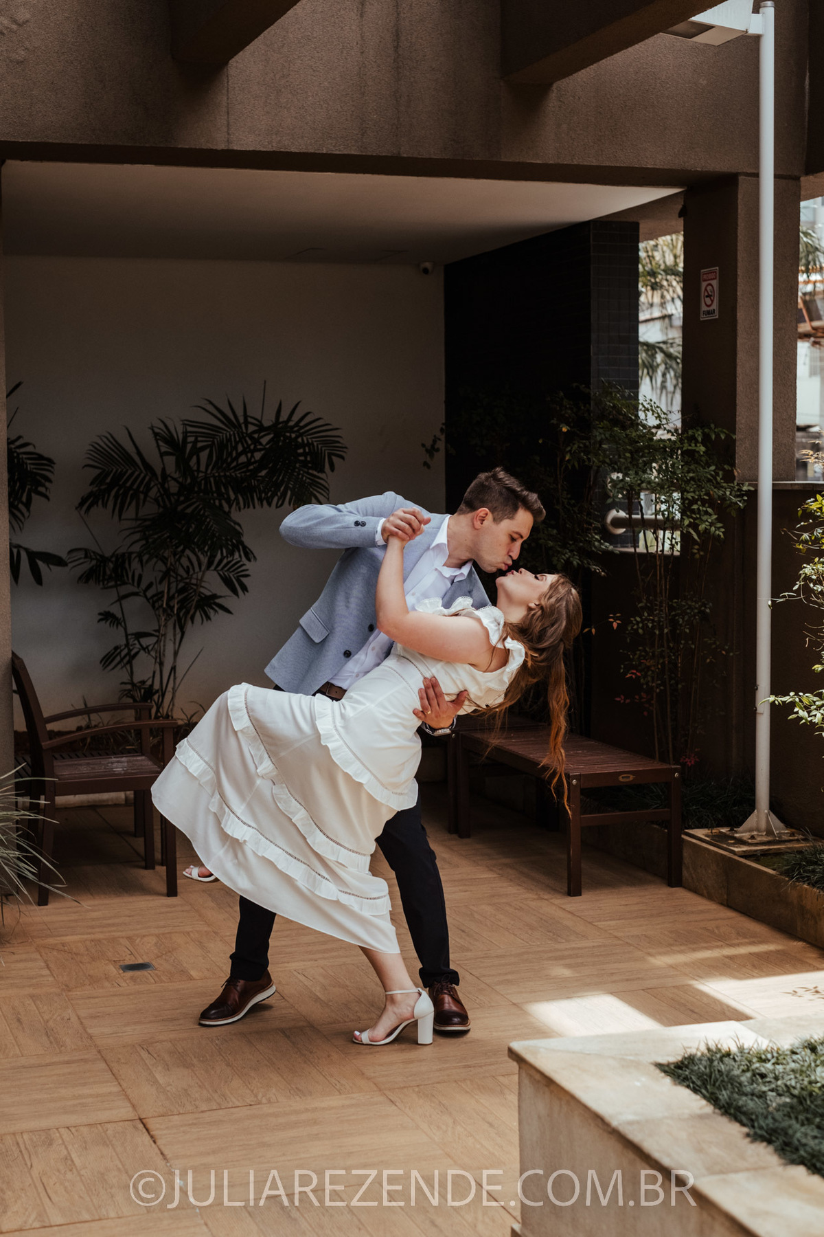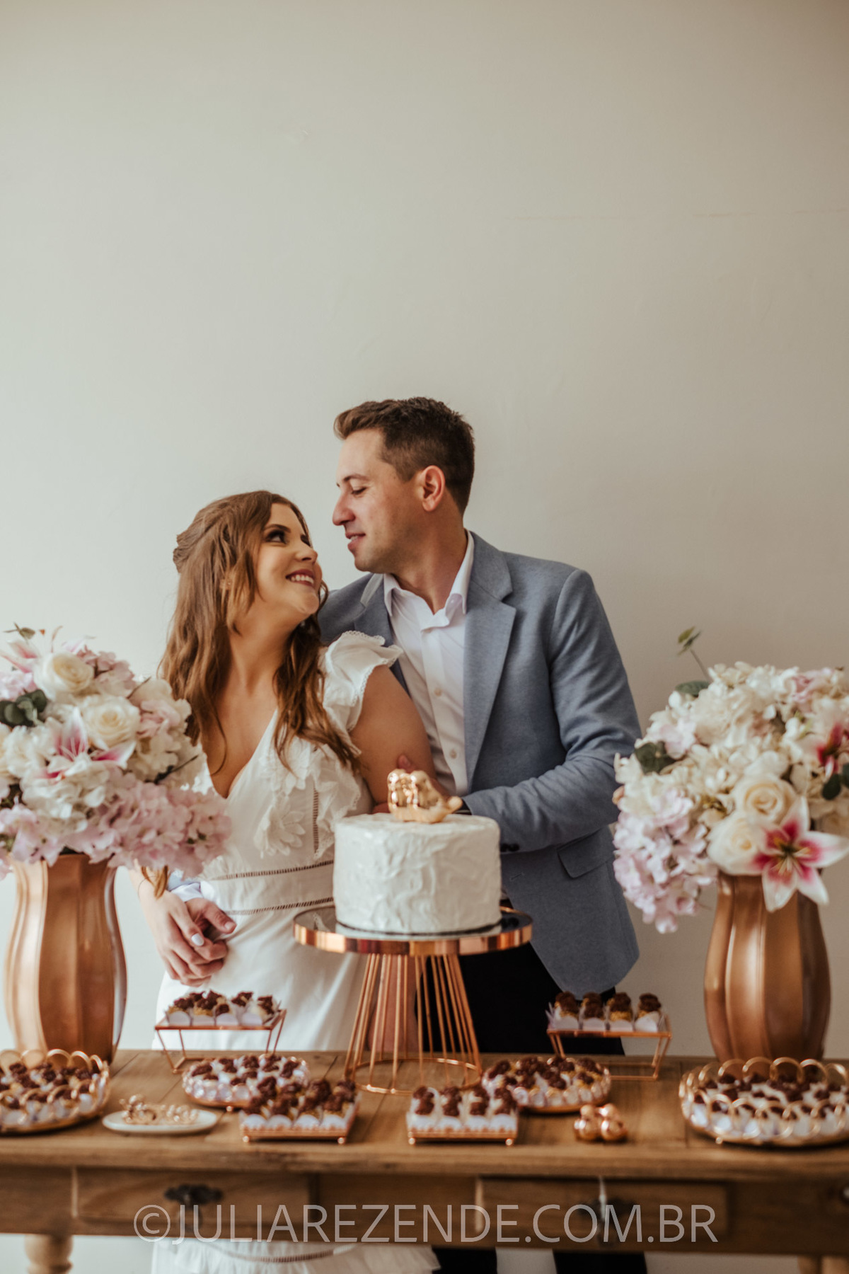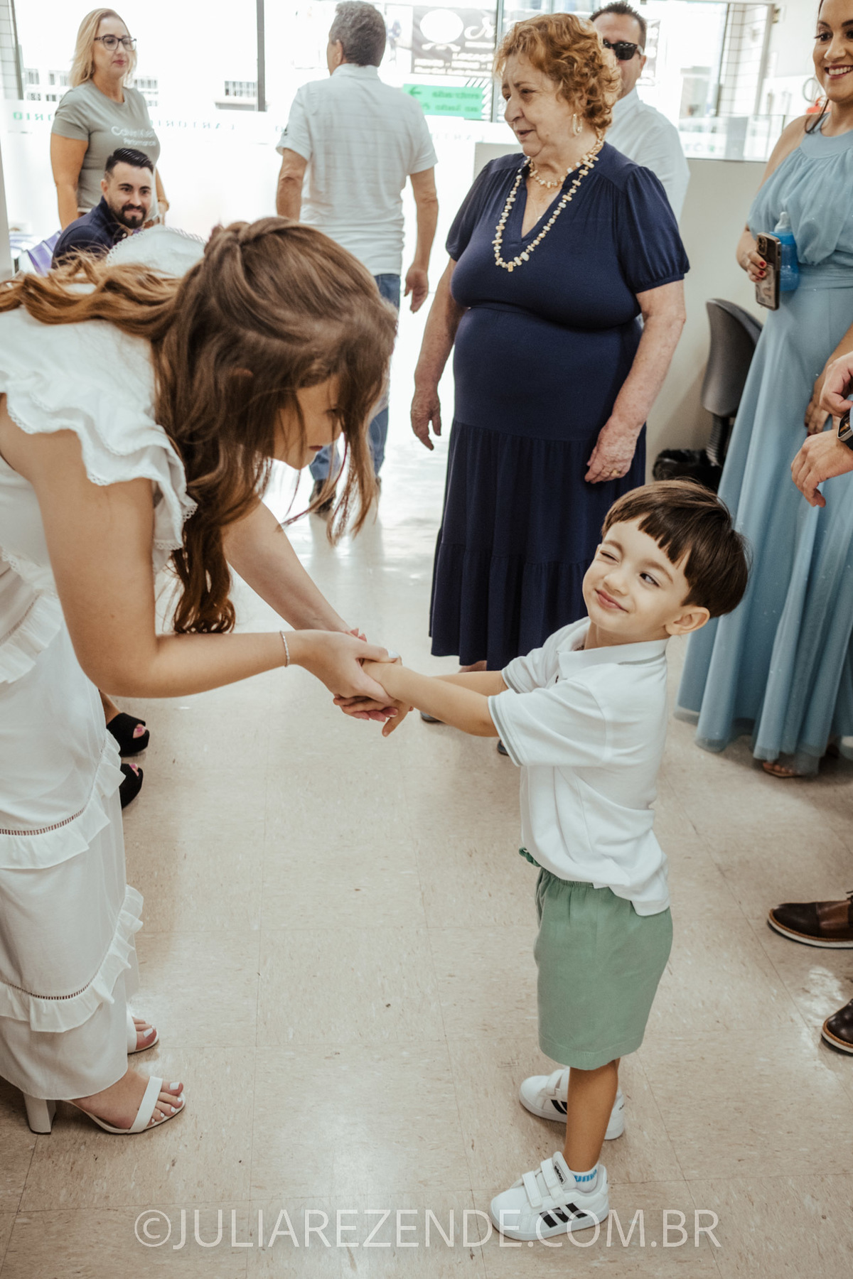 A celebração continuou no salão de festas do prédio do casal, criando um ambiente super íntimo e acolhedor. A simplicidade do evento se harmonizou perfeitamente com o amor abundante, resultando em um dia verdadeiramente especial. Cada detalhe, da decoração às risadas espontâneas, foi capturado para que possamos sempre relembrar e celebrar esses momentos incríveis.