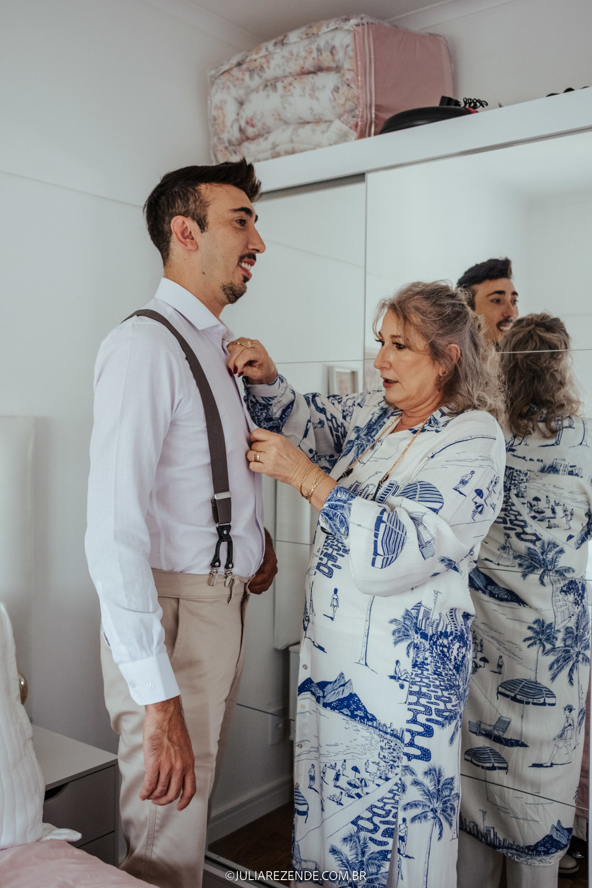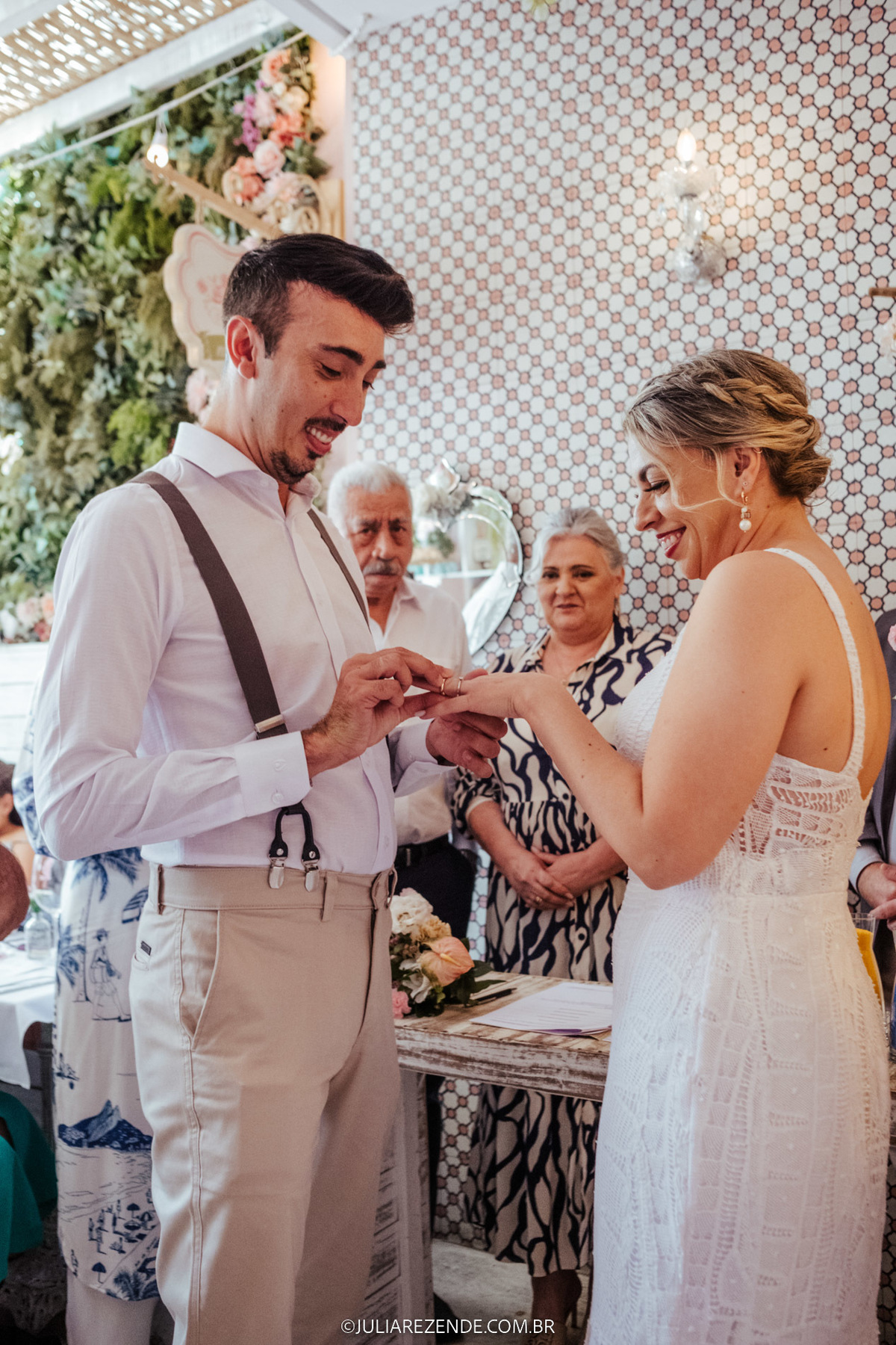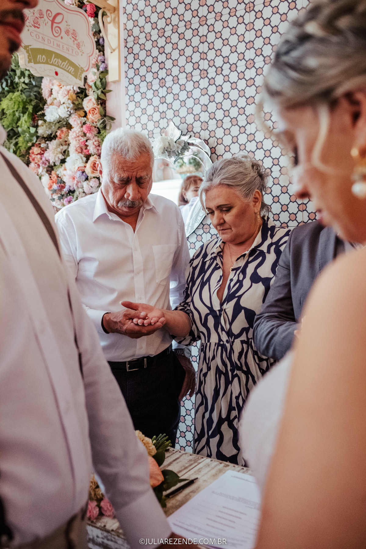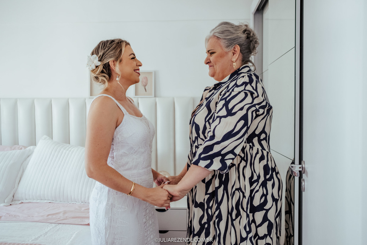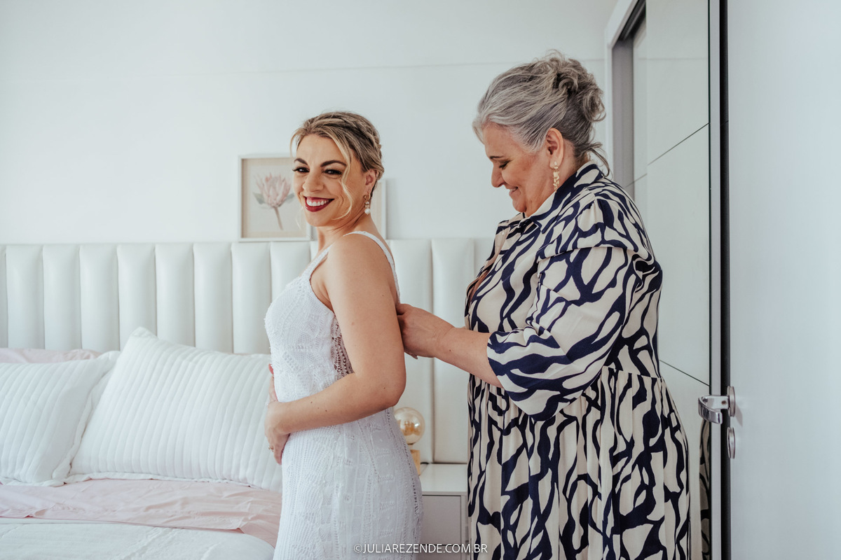 O dia começou na casa do casal, em um cenário íntimo e cheio de emoção, onde se arrumaram juntos, acompanhados pelas suas mães, num gesto de ternura e proximidade familiar. A cerimônia, realizada no Restaurante Condimento - um local pelo qual tenho um carinho especial e sempre recomendo -, ocorreu numa quinta-feira, marcando o início da primavera. Essa escolha de dia e local foi simplesmente perfeita, alinhando-se com a beleza e a singularidade do evento.
