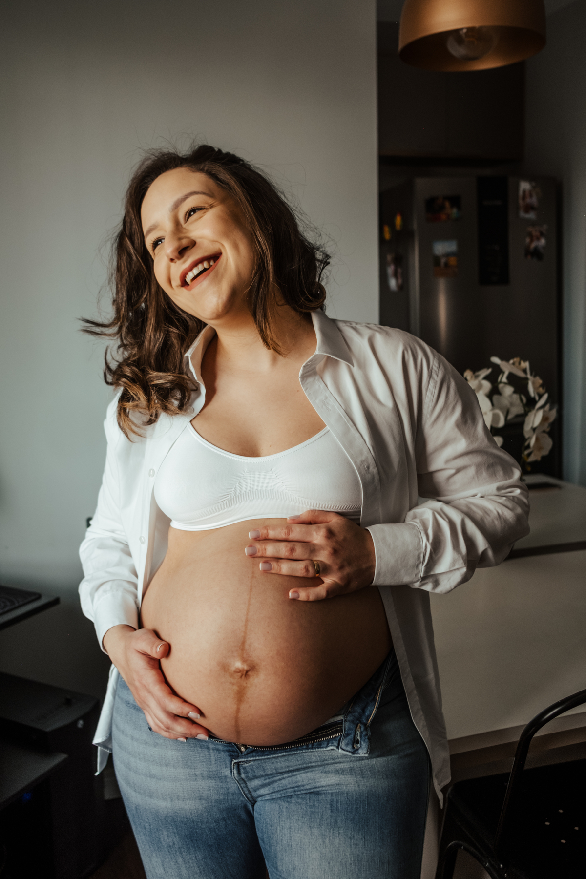 Realizar a sessão na casa deles adicionou um toque de proximidade e afeição às fotografias, evidenciando a cumplicidade e a preparação amorosa para a chegada de sua filha. A capacidade de capturar a essência desse momento em um ambiente familiar fez cada imagem ainda mais significativa e tocante.